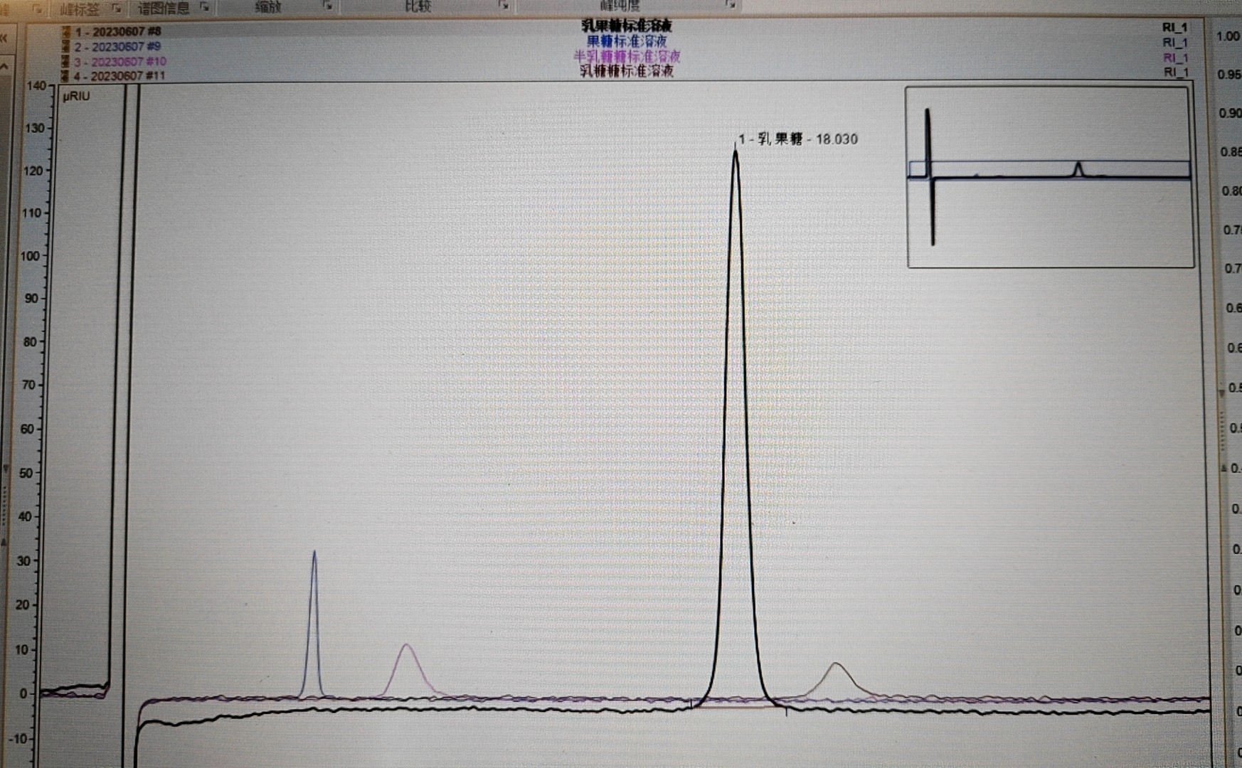 以示差折光检测器测定,柱温和检测池温度均为40°C;流速为每分钟1.5ml; 进样体积20。系统适用性要求,系统适用性溶液色谱图中,出峰顺序依次为果糖、半乳糖、乳果糖与乳糖,果糖峰高的信噪比应大于10,乳果糖峰与乳糖峰间的分离度应大于2.0。